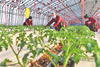 3月3日,在山东省乳山市城郊特色农业产业示范区,工作人员在温室大棚里管护西红柿。近年来,乳山市引导特色村庄结对合作,发展有机蔬菜和休闲观光农业,带动农民增收、农业增效,助力乡村振兴。新华社记者 郭绪雷 摄