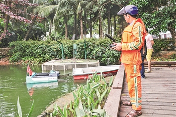 3月3日,环卫工人操控无人驾驶清洁船在海南省海口东湖清理湖面。