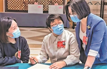 3月3日,全国人大代表、北京市政路桥科技发展公司研究院副院长、三检所总工程师田春艳(图中)和其他代表一起交流,完善自己的议案。(受访者供图)