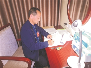 3月4日晚,全国人大代表、山西大同市公共交通有限责任公司三分公司驾驶员冯冰正在驻地修改《关于深化产教融合培养更多技术技能人才的建议》。鲍安 摄
