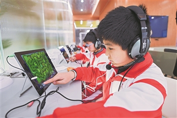 3月3日,在浙江省嘉兴市儿童青少年心理健康服务总站,学生们在通过小游戏来学习情绪调整和集中注意力。
