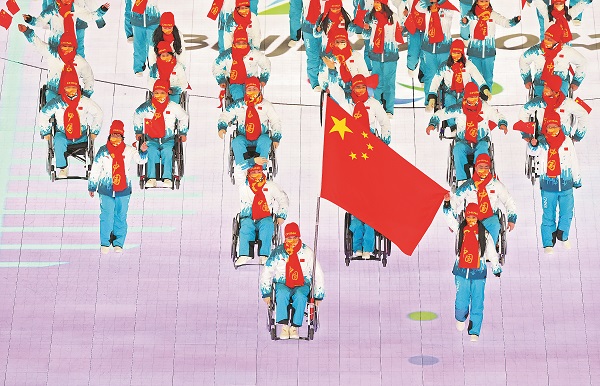 压题照片:3月4日晚,北京2022年冬残奥会开幕式上,东道主中国代表团入场。本报记者 窦菲涛 摄