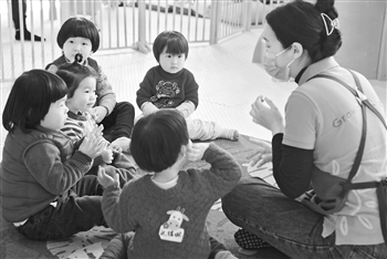 3月7日,在上海市静安区江宁路街道社区综合为老服务中心,“宝宝屋”的看护人员带领小朋友们玩游戏。近日,静安区教育局与江宁路街道合作试点的首批公益普惠的社区“宝宝屋”投入使用,为有幼儿的家庭缓解临时性托育难题。新华社记者 刘颖 摄