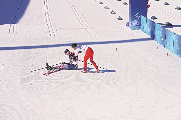 3月7日,在北京2022年冬残奥会越野滑雪男子长距离(传统技术-站姿组)比赛中,加拿大选手马克·阿伦兹冲过终点后趴在地上,已经通过终点的中国选手蔡佳云立即上前将他扶了起来。本报记者 窦菲涛 摄