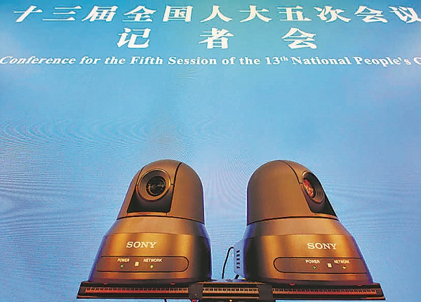 位于梅地亚新闻中心的高清摄像头和高清LED屏,可以连接北京人民大会堂主会场。本报记者 杨登峰 摄