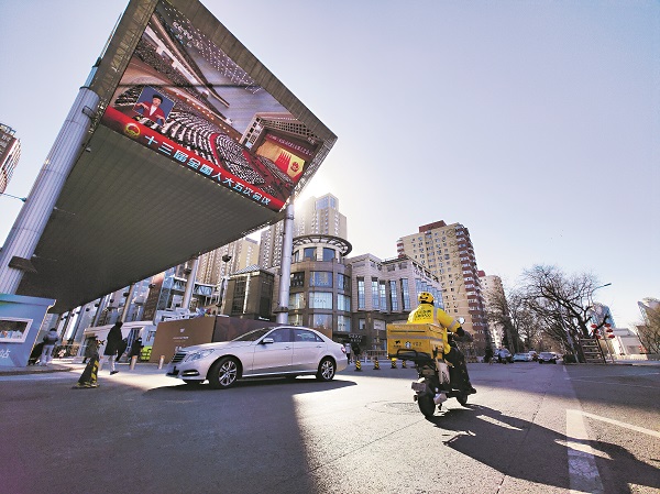 3月5日上午,北京CBD,一位快递小哥从直播十三届全国人大五次会议开幕会的大屏幕前经过。今年的政府工作报告中提到:完善灵活就业社会保障政策,开展新就业形态职业伤害保障试点。坚决防止和纠正性别、年龄等就业歧视……众多举措体现民生期盼。
