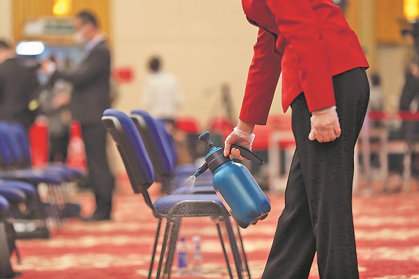 3月8日,梅地亚新闻中心,工作人员正在对会场进行消毒。