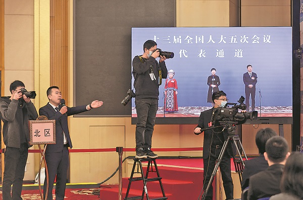 3月8日,在梅地亚新闻中心,记者在拍照。