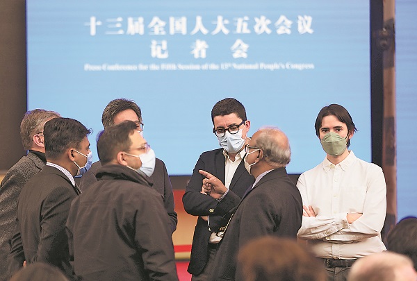 3月7日下午,参加两会采访的外国记者在记者会前一起交流。
