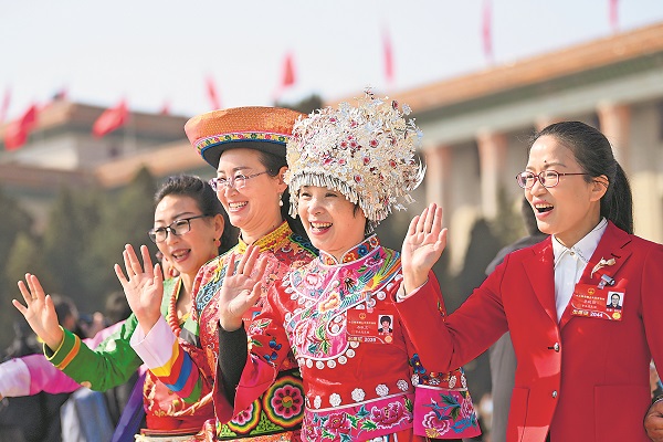 3月8日上午,十三届全国人大五次会议第二次全体会议结束后,几位女代表在人民大会堂前留影。苏思 摄