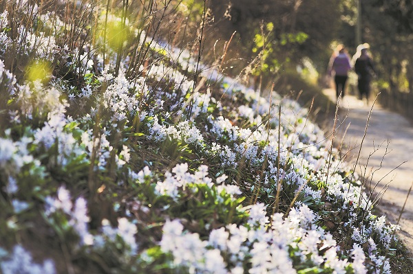 3月7日,在比利时布鲁塞尔的五十周年纪念公园,人们在花丛旁的小径上散步。时下的比利时布鲁塞尔正值早春时节,万物复苏,鸟鸣嘤嘤。新华社记者 郑焕松 摄