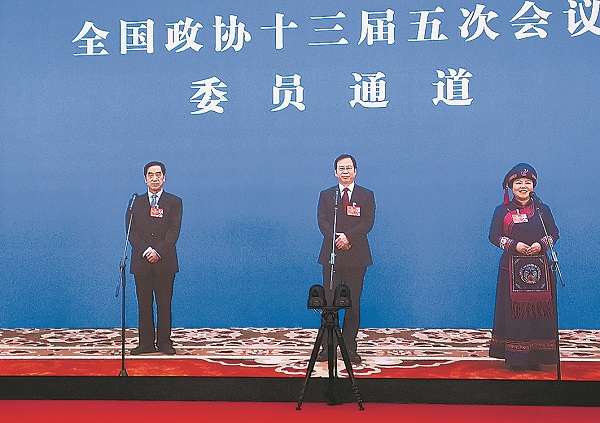 3月10日,3位全国政协委员在“委员通道”上接受采访。本报记者 车辉 摄