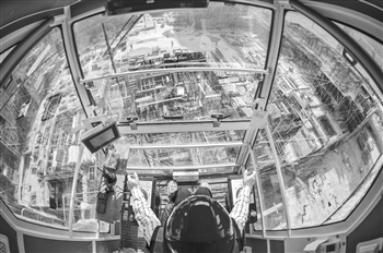 在武汉市中建三局总承包公司某工地上,张丽萍在塔吊驾驶室工作。