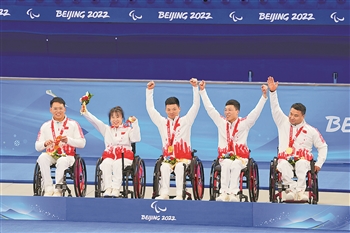图② 3月12日,北京2022年冬残奥会轮椅冰壶比赛结束,中国轮椅冰壶队击败瑞典队摘得金牌,成功卫冕。本报记者 窦菲涛 摄