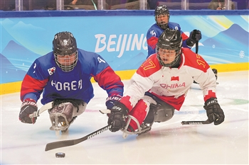 图① 3月12日,在北京2022年冬残奥会残奥冰球铜牌赛中,中国队以4:0的比分战胜韩国队,夺得铜牌。这是中国残奥冰球队首次参加冬残奥会。图为中国队前锋申翼风(右)在比赛中拼抢。本报记者 窦菲涛 摄