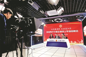 3月14日,“工会送岗位 乐业在江淮”安徽省电子企业直播招聘会在淮北市举行。直播通过“岗位描述+直播带岗”的形式,从工作环境、薪酬福利、发展路径等方面将招聘职位推荐给求职者。招聘会邀请了40多家优秀电子企业,提供了3000多个就业岗位。本报通讯员 张锋 摄
