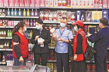 3月14日,四川省广安市广安区市场监管局北辰监管所执法人员和北辰街道网格员在一家超市检查酒类产品质量,打击假冒伪劣。