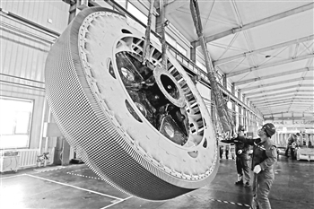 近日,工人在新疆哈密中车新能源电机有限公司风力发电机生产车间吊运定子。近年来,新疆哈密中车新能源电机有限公司抢抓“一带一路”发展机遇,不断加大研究、开发力度。目前已形成年产1.5MW、2.0MW、2.5MW以及2S系列直驱永磁风力发电机500台的制造能力,为新能源发展和碳减排注入了活力。蔡增乐 摄/人民图片