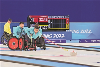 3月12日,北京2022年冬残奥会轮椅冰壶比赛落下帷幕,中国轮椅冰壶队击败瑞典队成功卫冕。图为中国轮椅冰壶队队长王海涛准备投掷冰壶。本报记者 窦菲涛 摄