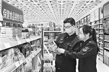 3月11日,安徽省合肥市蜀山经开区市场监管所的工作人员走进辖区内商超,为消费者提供消费知识普及、消费维权咨询等服务,净化消费市场环境,维护消费者权益。图为当日,市场监管所工作人员对超市内商品随机抽检。新华社记者 杜宇 摄
