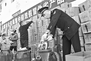 3月15日,山西太原,当地公安集中销毁假冒伪劣白酒。当日是国际消费者权益日,太原警方联合相关部门加大查处假冒伪劣商品工作力度。武俊杰 摄/视觉中国