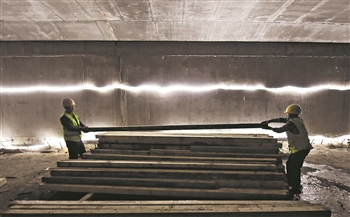 3月16日,工人在湖北武汉市武昌滨江核心区地下空间环路工程工地施工。