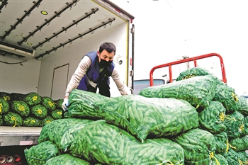 图为3月19日江桥批发市场的短驳服务人员在搬运蔬菜。