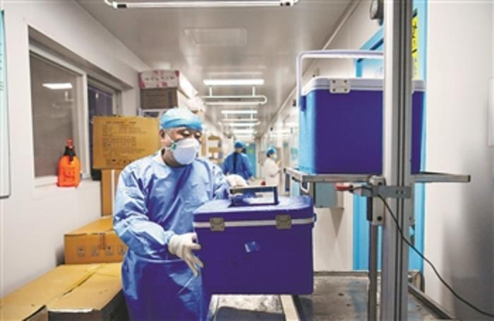 3月19日晚,位于天津市第一医院的天津市河北区城市核酸检测基地内灯火通明,工作人员紧张而有序地检测着当日该区三个街道的核酸采样样本及复检样本。