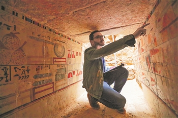 3月19日,在埃及首都开罗以南的塞加拉地区,考古工作者在一处古墓内介绍壁画。埃及旅游和文物部19日在首都开罗以南约30公里的塞加拉古墓群发掘现场宣布,埃及考古队在此地新发现5座距今4000余年的墓葬,保存情况良好。