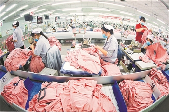 3月22日,山东省青岛市即墨区即发集团有限公司的工人在生产出口到海外市场的服装产品。
