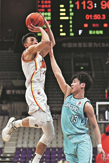 3月21日,吉林九台农商银行队球员孔德高(左)在比赛中上篮。当日,在辽宁沈阳进行的2021-2022赛季中国男子篮球职业联赛(CBA)第三阶段第38轮比赛中,吉林九台农商银行队以120比100战胜青岛每日优鲜队。新华社记者 王乙杰 摄