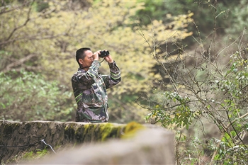 肖治金用望远镜观察黑叶猴活动情况(3月17日摄)。