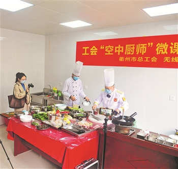 为让“宅”在家里的职工吃得更健康、更有味道,近日,浙江省衢州市总工会推出“空中厨师”云课堂,特邀中国烹饪大师、中式烹饪高级技师马临清,通过无线衢州视频号以及抖音号直播,为全市职工呈现了一堂有滋有味的“空中厨师”云课堂。图为云课堂现场直播。