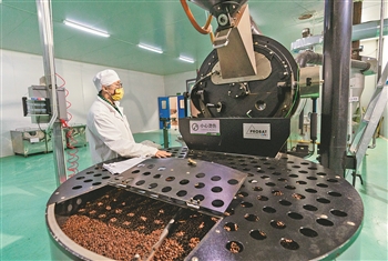 图为云南普洱爱伲庄园咖啡有限公司内,工作人员在烘焙豆生产线上忙碌。新华社记者 陈欣波 摄