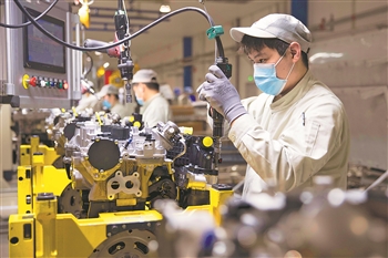 3月23日,工人在哈尔滨东安汽车动力股份有限公司生产车间内进行装配作业。