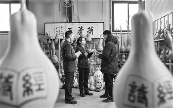 在河北省鸡泽县魏青村非物质文化遗产“葫芦烙画”基地,烙画技术能手正在听鸡泽县税务局青年干部讲解国家最新减税降费政策,并介绍非物质文化遗产保护、传承等情况。
