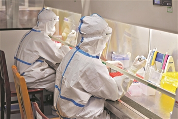 近日,在南昌大学二附院医学检验中心核酸检测实验室,核酸检测员在对送来的标本进行检测。截至3月22日,他们共完成南昌市第一、二、三轮核酸检测标本4.5万余份,发出核酸检测报告48万余份。
