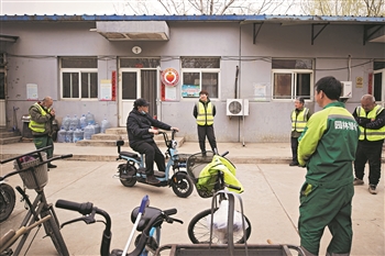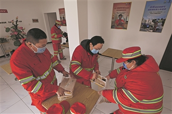 3月22日,景山公园东门外环卫暖心驿站,张连琪(右二)和同事吃完所里分发的午饭后,将饭后垃圾进行分类。