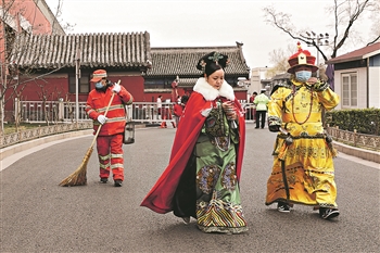 3月22日,东城区环境卫生服务中心一所七条分队的张连琪正在清扫道路,穿着古装的游客从他的身边经过。