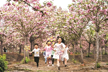 近日,在四川省眉山市仁寿县方家镇曲江社区的樱花园里,小朋友们在开心玩耍。