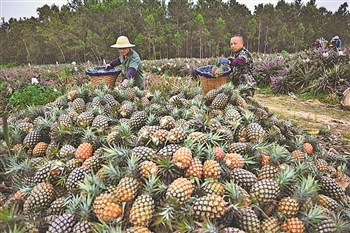 3月27日,工人在文昌市东阁镇田间采摘凤梨。时值春日,在祖国南端的海南文昌市农田里,板栗、地瓜、凤梨迎来丰收,人们忙着采摘、挑拣、装箱,一片繁忙景象。新华社记者 郭程 摄