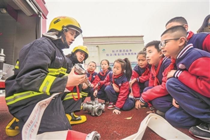 3月28日,浙江省湖州市长兴县吕山乡应急安全教育体验馆内,当地小学生在了解学习消防特种设备。当日,吕山乡中心小学联合应急管理站开展平安课堂活动,学生们通过VR逃生等情景互动体验,学习安全知识。本报通讯员 吴拯 摄
