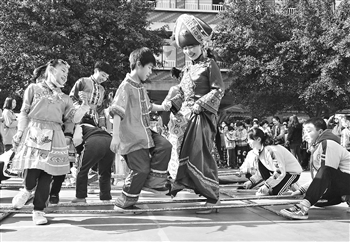 3月28日,广西桂林市大河中心校组织师生举行“三月三”民族运动会暨农事运动会。竹竿舞、踩高跷、插秧苗、浑水摸鱼、挑担运粮……身穿民族盛装的师生一起在欢乐、祥和的氛围中迎接“三月三”的到来。李凯 摄/人民图片