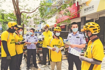 3月30日,在云南省西双版纳傣族自治州景洪市,外卖小哥在送餐的同时将禁毒宣传单送给客户,这是西双版纳出入境边防检查站工会携手外卖公司开展的全民禁毒宣传活动。当天,该站工会还把法律知识材料送给外卖骑手,为他们普法,同时感谢他们成为禁毒宣传的“先锋队”。据了解,该站工会探索“电商+普法”模式,有效提升了普法的精准度和吸引力。本报记者 赵黎浩 摄