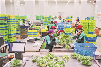 凌晨时分,2.3万平方米的蔬果大仓灯火通明,生产、分拣、包装……当日起,上海浦西地区的核酸筛查全面展开,涉及人数1600万人。封控期间,市民在线购买蔬菜的需求进一步加大,各大“菜篮子”企业开足马力保障供应。新华社记者 丁汀 摄