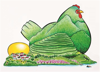 “绿水青山,就是金山银山”。这句话,堪称智者的发现,也直观地阐释了生态文明和绿色发展理念。漫画《馈赠》为我们提供了新的发现,那便是,“绿水青山”何以堪称“金山银山”?答案既生动且有趣。在闫伟先生笔下,绿水青山被演绎成为一只憨态可掬的硕大母鸡,注意,它已然为我们生产了一枚巨大的金蛋。在金蛋面前,被大自然母亲呵护的村民,正在默默享用母鸡的“馈赠”。没错,这里的百姓“有福了”!