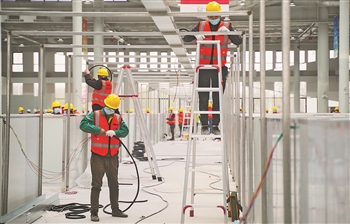 中建三局的工人在花博园复兴馆方舱医院内作业(3月31日摄)。记者4月3日从上海市卫健委了解到,全国多地援助上海的医疗队于近日分批抵达上海,其中部分医疗队已入驻方舱医院。花博园复兴馆方舱医院共分4个区域,有2700多张床位。新华社记者 丁汀 摄