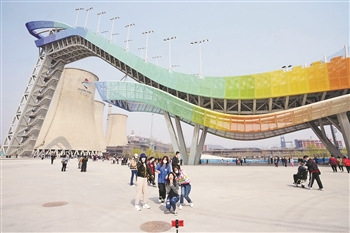 4月4日,游客在北京首钢滑雪大跳台区域参观游览。时值清明假期,人们来到户外踏青、游玩,享受春光。新华社记者 鞠焕宗 摄
