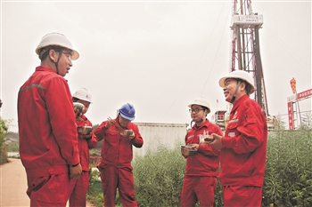3月30日,在位于川渝地区的东峰502-1HF井,中国石化经纬公司西南测控公司员工在现场吃工作餐。在石油企业生产一线,野外吃饭早已是员工们的“家常便饭”。