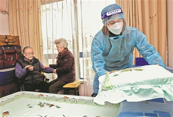 4月5日,志愿者翁耀昇(右一)帮助老人整理房间。在上海市普陀区锦绿新城居民区的1600余户居民家庭中,有不少空巢老人。疫情封控管理期间,志愿者纷纷行动起来,为老人们跑腿送餐、协助核酸检测、上门保洁。 新华社记者 陈飞 摄